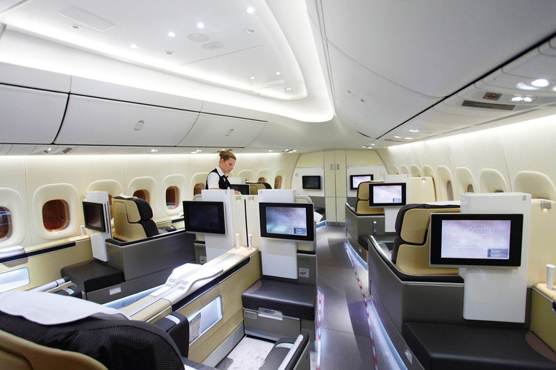 即使数量最多的经济舱,汉莎747-8也进行了大幅度提升,每个座椅都有独立的影视系统,座位上还都配备了电源插座。商务舱的座椅也比以前更舒适、更宽敞,淡灰色的座椅配上蓝色的靠背再加上汉莎的标识,漫长的旅行也不会太乏味。