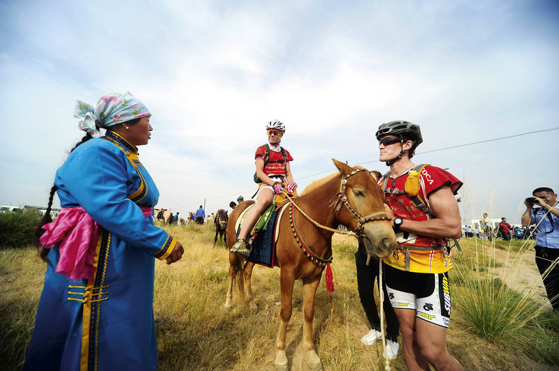 ( 8月31日,新西兰探险队的艾丽娜和理查德准备进行2公里马术项目比赛 )