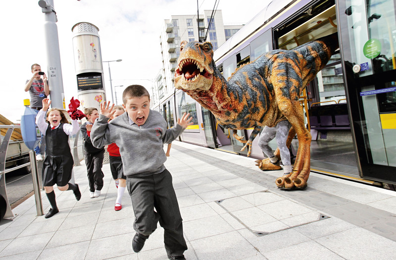 舞台剧“与恐龙同行:震撼演出”即将在都柏林的体育场上演,主办方把一只幼小的霸王龙模型用轻轨运到商业区搞宣传。剧中有全球知名的设计师和科学家合作创造出的20只、10种真实比例的恐龙,除了霸王龙,还有板龙、剑龙、异龙、腕龙、鸟脚龙、甲龙、牛角龙、犹他龙和流连龙。