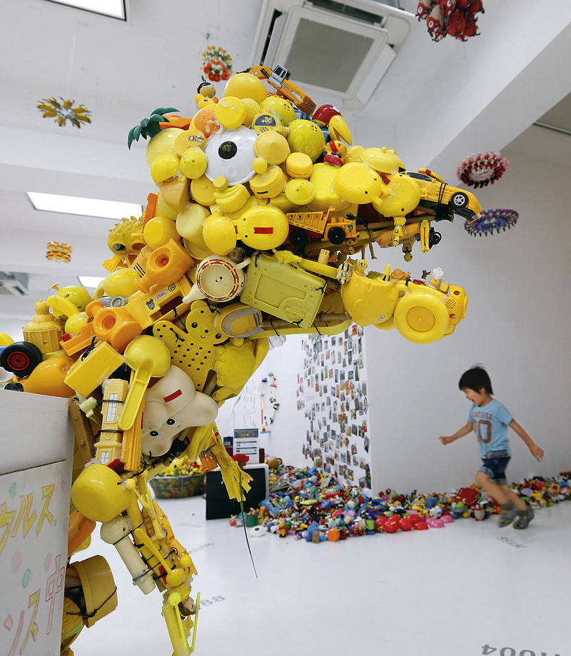 日本艺术家藤浩志把社会组织13年来收集的近10万只被丢弃的玩具用胶带和铁丝扎在一起,做成一件装置艺术,称之为:“中央返回车站——这些玩具来自何处?”