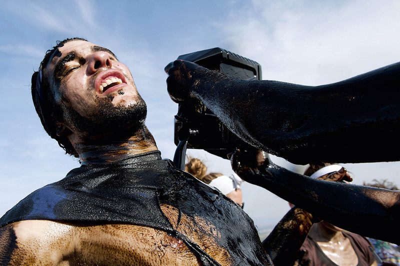 9月6日,西班牙人庆祝卡斯卡摩洛斯节,人们往身上涂满黑色油脂,投入到狂欢之中。