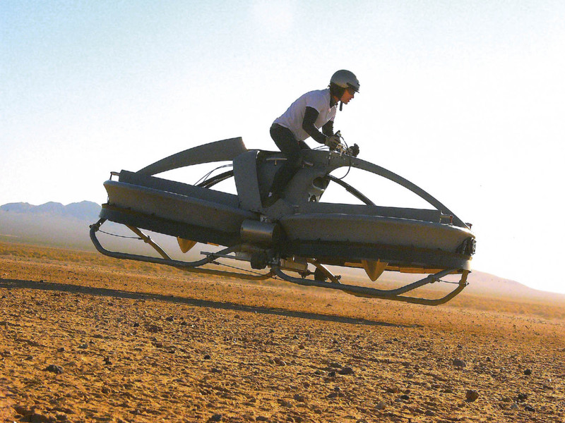 美国一家公司研制出了飞行摩托,这种摩托可以在离地近5米高的地面上飞行,时速约为48公里。飞行摩托的驱动装置是其下面两个大大的圆盘,利用这两个圆盘的旋转产生上升气流,可让摩托升到空中。
