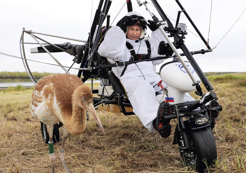 9月5日,俄罗斯总统普京在西西伯利亚北部亚马尔半岛上空驾驶三角翼动力滑翔机,给一群放生的鹤“带路”,让它们向过冬地点迁徙,以拯救这一濒临灭绝的物种。
