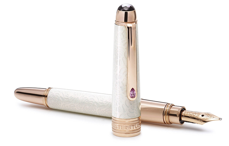 万宝龙大班莫扎特珠宝书写系列中的“玫瑰”墨水笔,珍珠白漆面笔杆有精致的图案雕刻,18K玫瑰金笔嘴、笔头及装饰细节彼此呼应。笔夹镶一颗水滴形粉红蓝宝,笔帽顶镶珍珠贝母六角白星标志,优美如莫扎特的咏叹调。