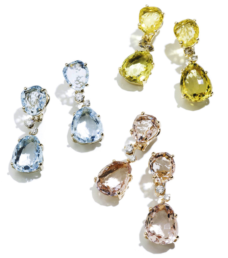 宝曼兰朵Bahia系列耳环由水蓝色的海蓝宝、橘粉色的铯绿柱石和金黄色的金绿柱石镶嵌而成,不规则切割的宝石配褐钻或明亮的白钻。绿柱石的名称Beryl意为“海水般的蓝绿色”,它的色泽也似海水般晶莹通透。