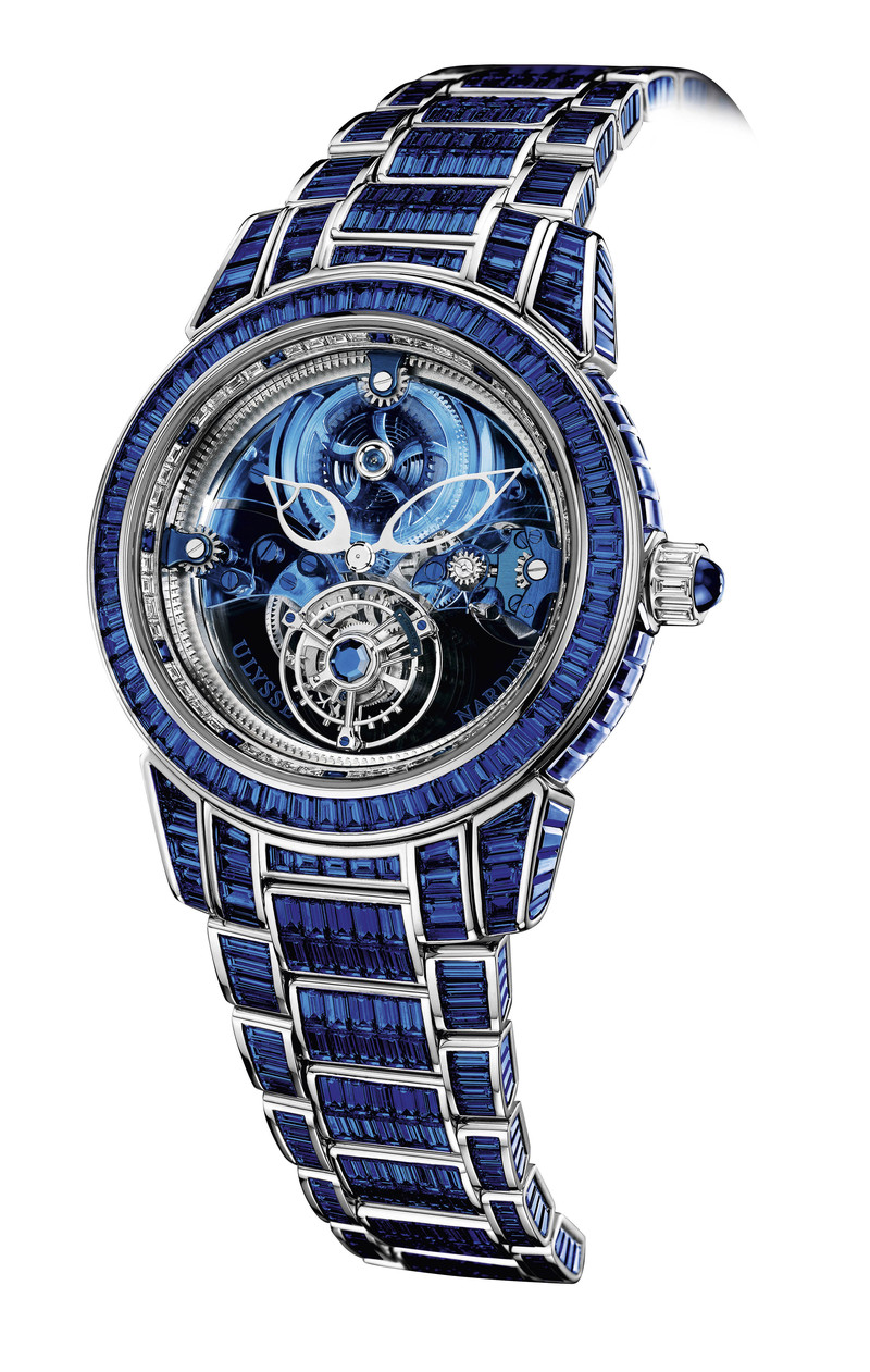 雅典表“皇家蓝Royal Blue”飞行陀飞轮钻石腕表由137颗长方形蓝宝石和48颗长方形钻石镶嵌而成,突显其圆浑的外形,铂金链带装饰608颗方形蓝宝石。发条盒、时分针及陀飞轮以直线排列在表盘上,飞行陀飞轮飘浮在基板上自转,显示出难得的平衡美学。