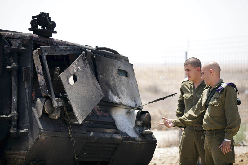 ( 8月6日,以色列凯里姆沙洛姆,以色列士兵查看被武装分子劫持的埃及军方车辆残骸。武装分子驾驶该车驶入以色列境内后被击毁 )