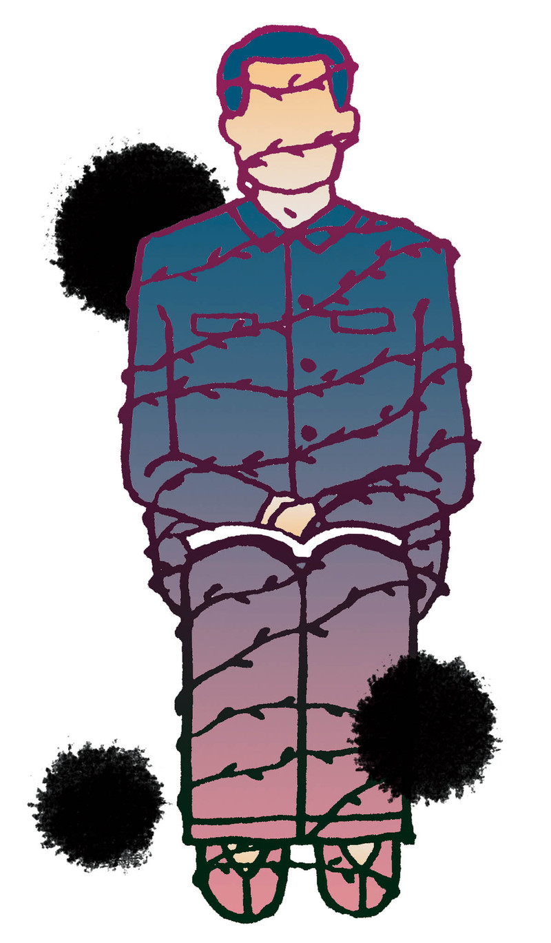 在这漫天灰尘、吐沫横飞、树叶肆虐的街头,老七显得有些碍眼。首先,他的腿上总是摊开一本书,有时,很久都不见他翻动一页,恰似两眼和书上的符号相互粘住了一样,仿佛坐在那里的只是他的躯壳而已。其次,他干净得过头,一身蓝色卡其布中山装已被洗得发白,却被他穿得有模有样,布鞋宛如刚洗晒过,他半秃的脑袋上,所剩不多的头发从来都一丝不乱。莫非这尘土、这风都没有吹进他的世界?