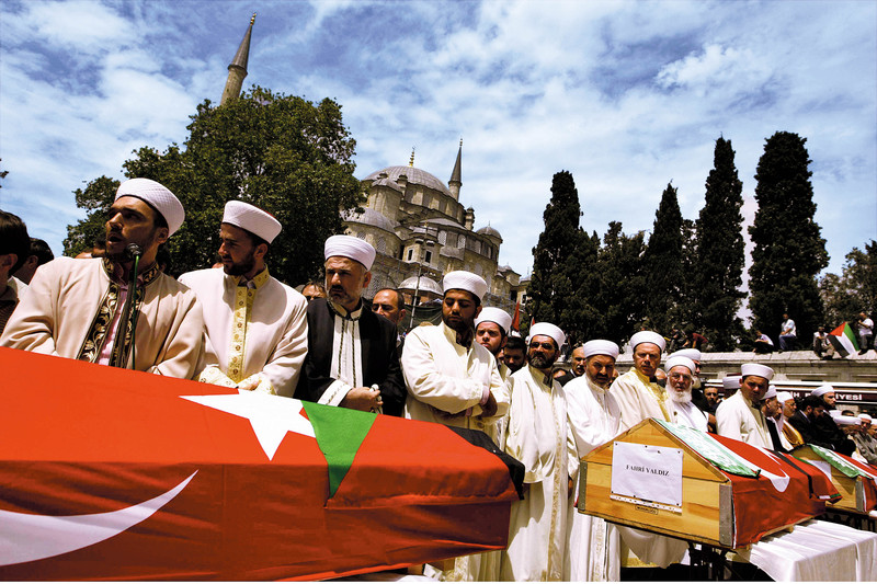 ( 6月3日,土耳其伊斯坦布尔,数千人参加了在以色列武力拦截加沙救援船队中丧生的9名遇难者的葬礼 )
