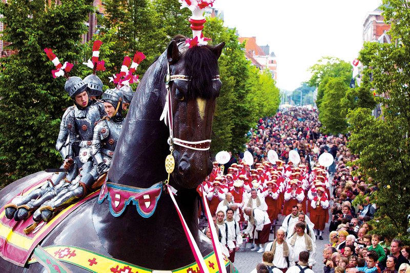 在比利时首都布鲁塞尔西北30多公里的登德尔蒙德,来自范达姆家的四兄弟骑在彩裙木马上参加十年一度的彩裙木马巡游。 )