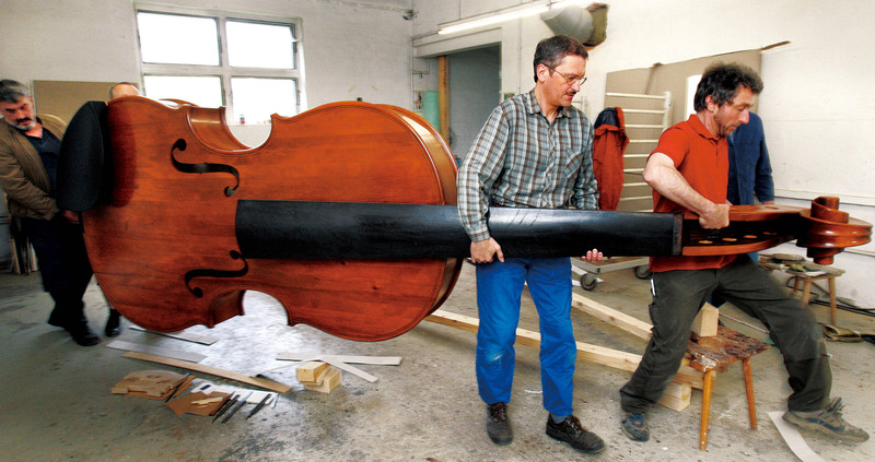 德国东部城市马克诺伊基兴的乐器在全世界是极负盛名的。3位制琴师通过纯手工的工艺,打造出一件高4.28米、宽1.45米,重达100公斤的巨型小提琴,虽然块头要比普通版的“兄弟”们大了不少,但是它依旧能演奏出动人的旋律。 )
