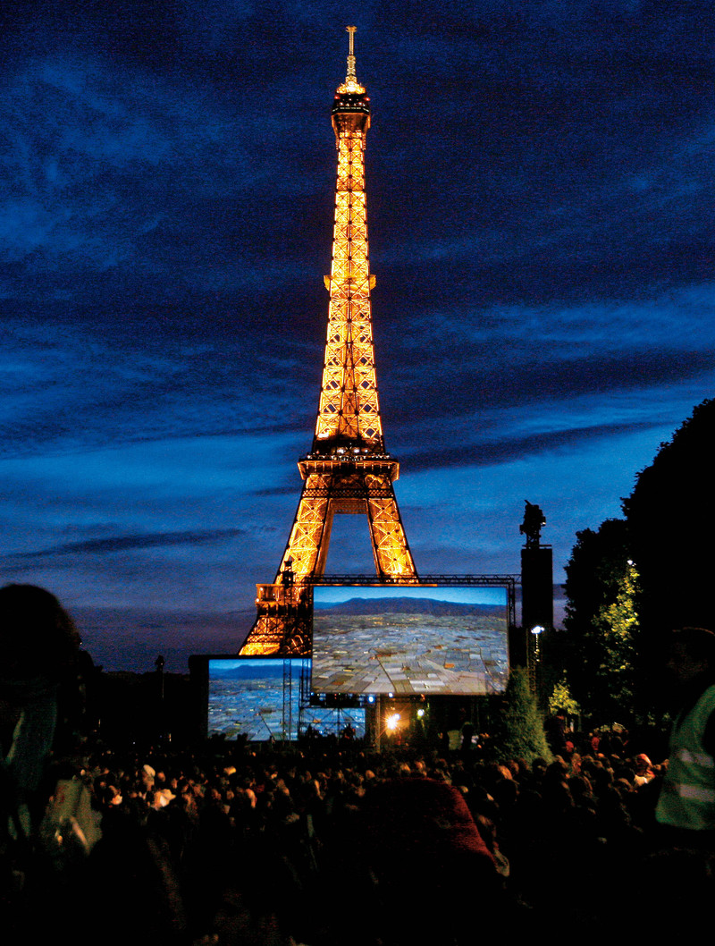6月5日,法国巴黎,当地人们在埃菲尔铁塔下通过大屏幕观看法国著名航空摄影师贝特朗拍摄的环境保护影片《地球很美有赖你》首映。当天是世界环境日。 )