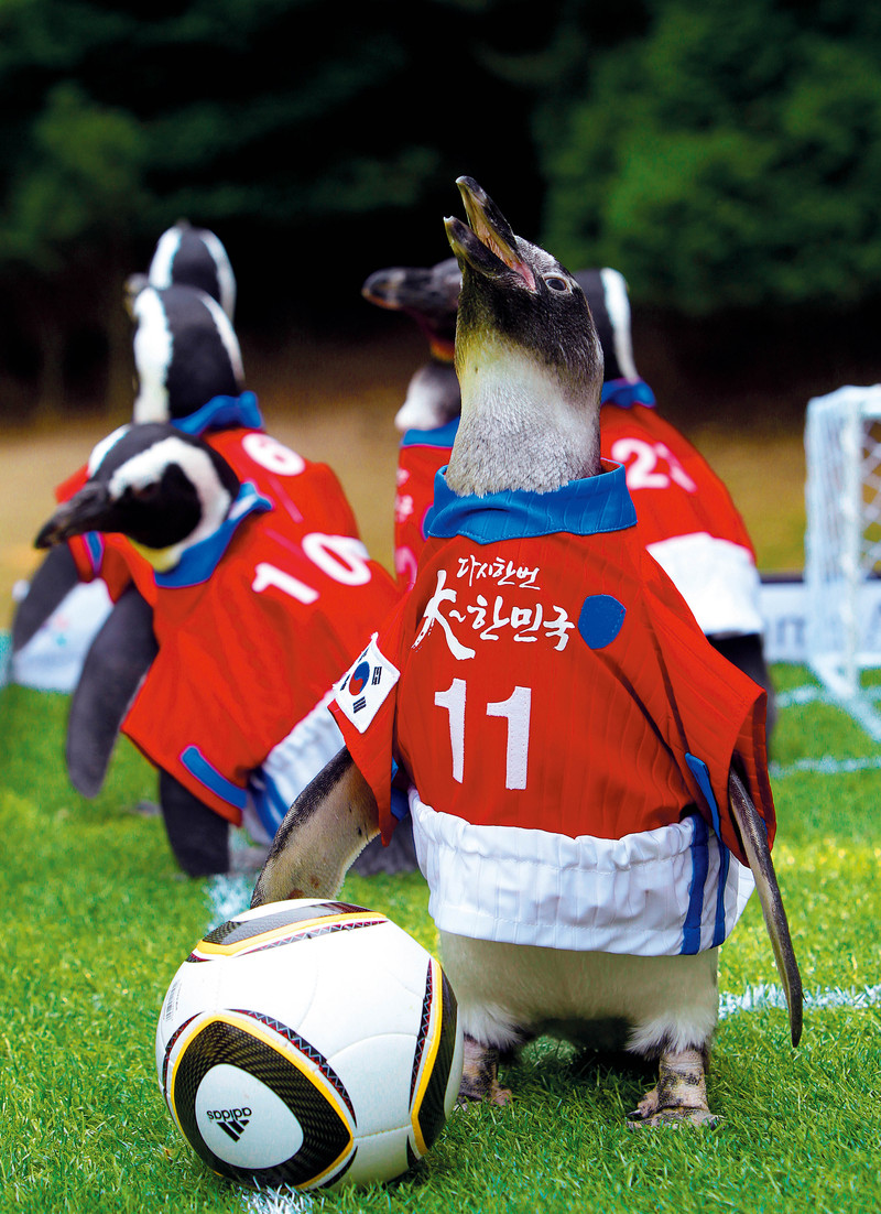 6月3日,韩国龙仁,为迎接世界杯,小企鹅穿上韩国队服参加足球赛。 )