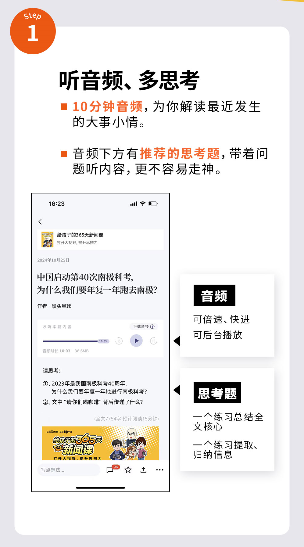 并且会在365天的时间里,带来每周一、三、五的深度阅读推送,周二四的浅读新闻。此外,每个月都会有一篇月度新闻总结,每半年有一篇半年新闻总结——将全年一共260+期的时事热点和各类知识,掰开揉碎,深入解读,提供给孩子一个每天都可以提升认知力的可靠渠道。