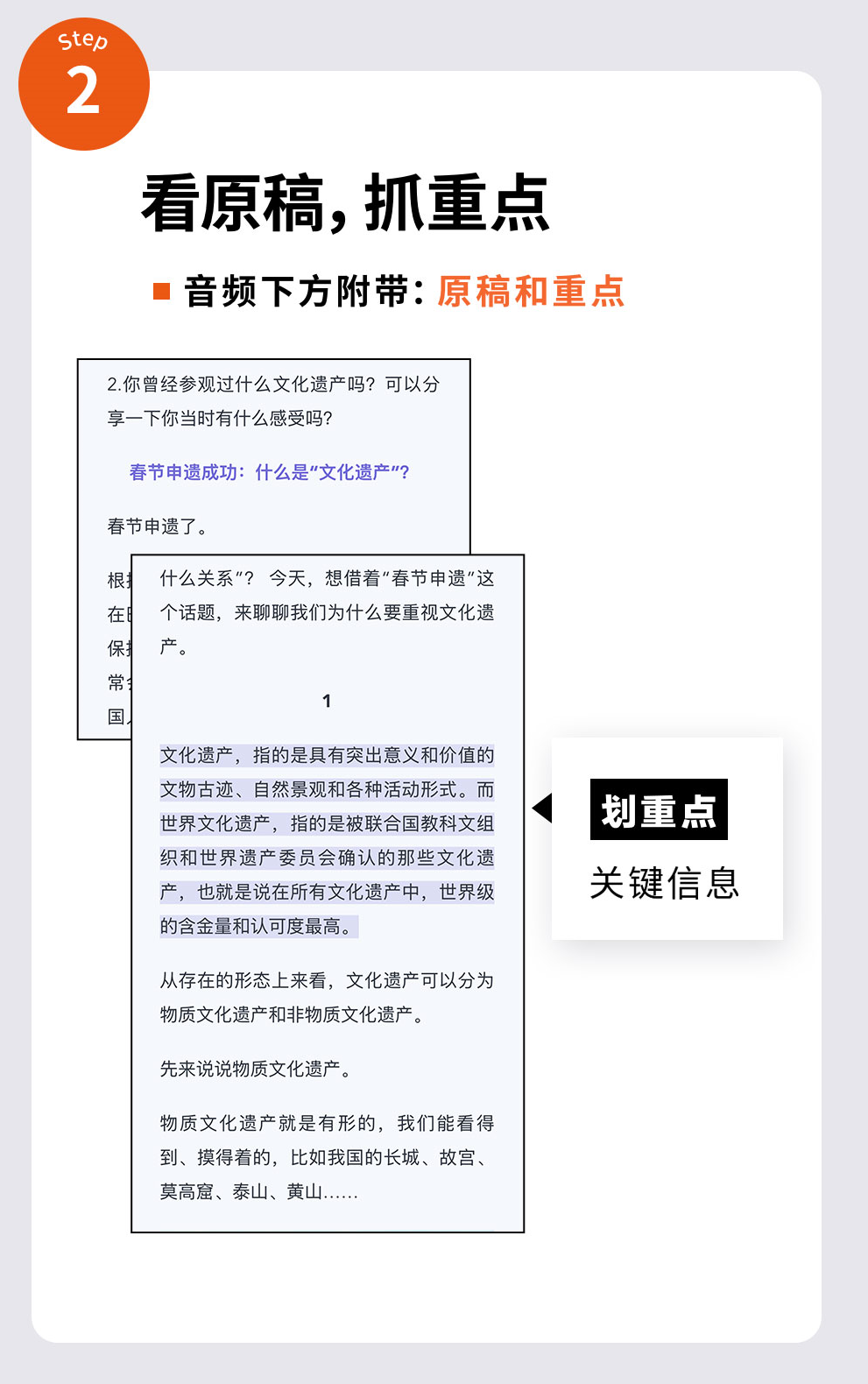 其次,课程会提供音频原稿、图片,一边听一边看,更方便孩子理解。