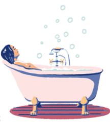 淋浴很棒,很环保,能很快让人恢复精力,通常是我们首选的清洁自己身体的方式。不过,好好泡个澡对健康也有许多好处,虽然水温太高会加重心脏负担,不过一次体验不错的蒸汽浴能更好地促进人体的氧气摄入,改善血液流动和肺功能,解决鼻塞,缓解关节或肌肉疼痛,并通过镇静神经系统来减轻炎症,缓解焦虑和压力。泡澡最起码能迫使我们放慢节奏,专注于当下,达到一种类似于冥想的状态。泡澡是一种简单的、全方位的身体康复体验。为了增强放松效果,你可以在水中加入浴盐或精油(见第 131 页)。把在浴缸里度过的时间当作一段自爱和自我关切的时间!
