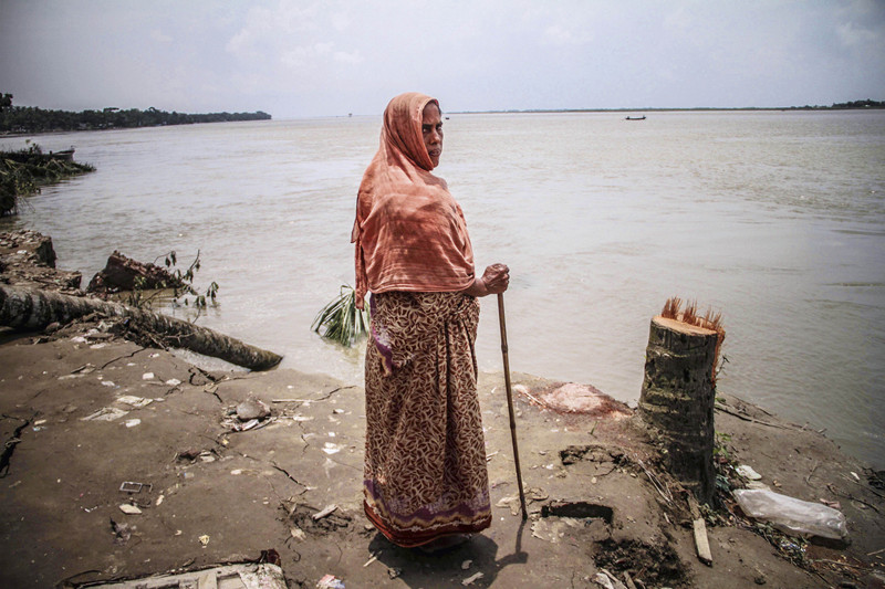 8月12日,在孟加拉首都达卡郊区,一名妇女站在涨水的博多河边看着被洪水淹没的村庄。今年夏天,孟加拉遇上10年来最严重的水灾。