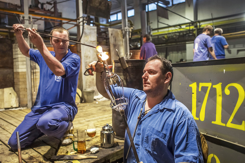 捷克 | 手工酒瓶 12月18日,哈拉霍夫镇玻璃制品厂,融化车间的工人在制作酒瓶的底座。这家玻璃制品厂是波希米亚地区仍在运行的最古老的玻璃厂,创建于1630年,至今仍保持传统的纯手工制作,制作时工人不戴手套、帽子和面罩。该厂的特色产品是高脚杯,有30多种不同的颜色。