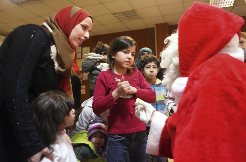 德国 | 圣诞老人 12月14日,在一家移民庇护所,一位女孩子在跟“圣诞老人”交谈。德国预计在年底之前将接收100万难民。