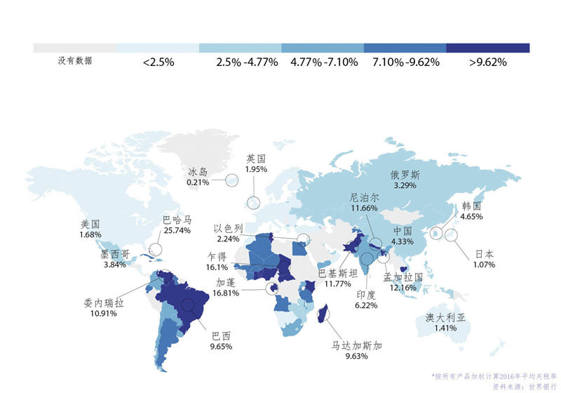 欧盟28个国家内部实行零关税,对于来自欧盟外的商品征收的税也是比较轻的。近年来通过持续不断的贸易谈判,全球范围内关税水平一直在下降,整体税率水平并不高,如世界银行按照2016年所有产品加权计算的关税税率,美国为1.68%,日本为1.07%,英国为1.95%,作为发达经济体的欧盟也大致相仿。高关税国家和地区主要集中于欠发达国家,全球第一高关税的巴哈马达到了18.6%。非洲平均关税也非常高,如加蓬高达16.93%。而新兴市场关税处于中间状态,俄罗斯、中国和韩国都在4%左右。尽管同等发展程度的经济体平均关税水平相仿,但牵涉到个别产品,各国却不相同,此次特朗普要对欧盟加征汽车关税,就是基于双方税收的不对等,美国进口税率是2.5%,欧盟则是10%。