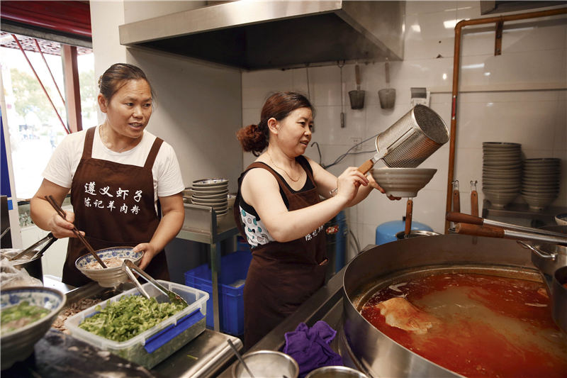 就着汤头吃完羊杂,如果还觉得不够过瘾,就可以自行加油辣椒调味了。更直接一点,还有来自遵义虾子地区的羊肉粉,羊肉汤锅里覆盖着整层红油,但撇去红油,下面的一锅仍是炖羊肉的原汤。煮好的米粉,舀一勺配着丁点儿猪油的原汤,再舀一勺漂浮着的红汤,配上炼制羊油,嗜辣的遵义人最爱这种味道。“遵义虾子陈记羊肉粉”的老板陈晓芬自豪地说:“要说辣椒,那一定是我们遵义的好,贵阳的辣椒没味儿,吃着不过瘾。”他们家每天都从遵义送辣椒过来,鲜辣椒已经提前舂碎,到店里直接炼红油,加在羊肉汤锅里。难得的是羊汤里撒上了薄荷,吃粉的时候平添一分清香,吃完粉喝汤,吹吹红油再吸一口,浓郁中带一点点辣味,从喉咙口一直暖到胃里。