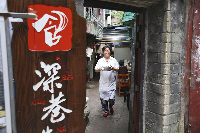 在贵阳能看到很多招牌打着“花溪牛肉粉”几个字,似乎代表了贵阳口味。但“花溪牛肉粉”原本只是花溪区一家牛肉粉馆的名字,在许多年前,它因口味好和环境优创出了名气,成为贵阳牛肉粉的一面旗帜。可惜的是,这家店没能保持住当年的水准,所谓的“花溪牛肉粉”只是一段记忆,说到传统的贵阳口味,现在已经涌现出了更多优质的小餐馆可以前去体验。“深巷牛肉粉”就是其中一家。光听这名字,就猜想位置一定隐秘。果然是在鲤鱼巷里一个弯弯绕绕、非常老旧的居民楼下,在一层阳台下面跟旁边的围墙之间搭一个简易顶棚,条件很简陋,但来光顾的客人却络绎不绝。