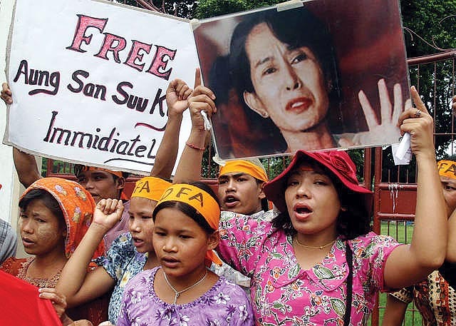 昂山素季所属的全国民主联盟(National League for Democracy)在1990年赢得缅甸全国大选,但由于军人集团的阻挠未能就职。她在1991年获得诺贝尔和平奖。2002年5月6日,在被缅甸军政府软禁19个月后,昂山素季获得自由,可以参与政治活动。但2003年5月,她再次被政府“监护”。 )