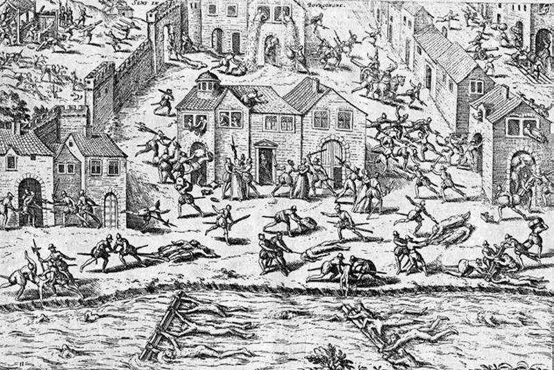 1572年8月24日晚,巴黎城中入住了一批新教徒(又称胡格诺教徒), 他们为了参加纳瓦拉国王的婚礼而来。当时正值法国天主教与新教混战的年代。皇后喀德林•美第奇和天主教集团首领亨利•介斯突然下达指令, 巴黎数万名天主教民伙同警察士兵发动对城内的胡格诺教徒进行了血腥的大屠杀。他们根据事先画在教徒居所门前的白十字记号闯进屋去,对那些熟睡未醒的人进行杀戮,然后将尸体抛进塞纳河中。包括科利尼上将在内的高官贵族都被处死,查理九世的妹夫亨利及孔德亲王也被迫改信天主教。继巴黎大屠杀之后,许多法国城镇也发生了屠杀新教徒的事件。由此又引发了一场旷日持久的宗教战争,直到1598年南特赦令颁布后才告停息。这是巴黎史上最血腥的一夜。由于此次天主教对胡格诺教徒的屠杀发生在圣巴托罗缪节的前夜,故称“圣巴托罗缪之夜”。
