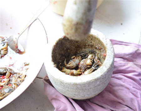 即将捉来的螃蜞清洗干净后,剥脐去腮,直接丢进臼里捣碎,然后以细纱布包裹,滤出汁水,加入适量蛋清促进结块,然后将肉汁入水煮开,生姜去腥,盐末稍许,葱花数粒,香菜若干,麻油几滴,就是一碗热腾腾香喷喷的所谓"螃蜞豆腐"了。虽有豆腐之名,可是里面却压根儿连一丁点儿豆腐都没有,只是呈着絮状的肉末儿看着有些像豆腐花儿而已。