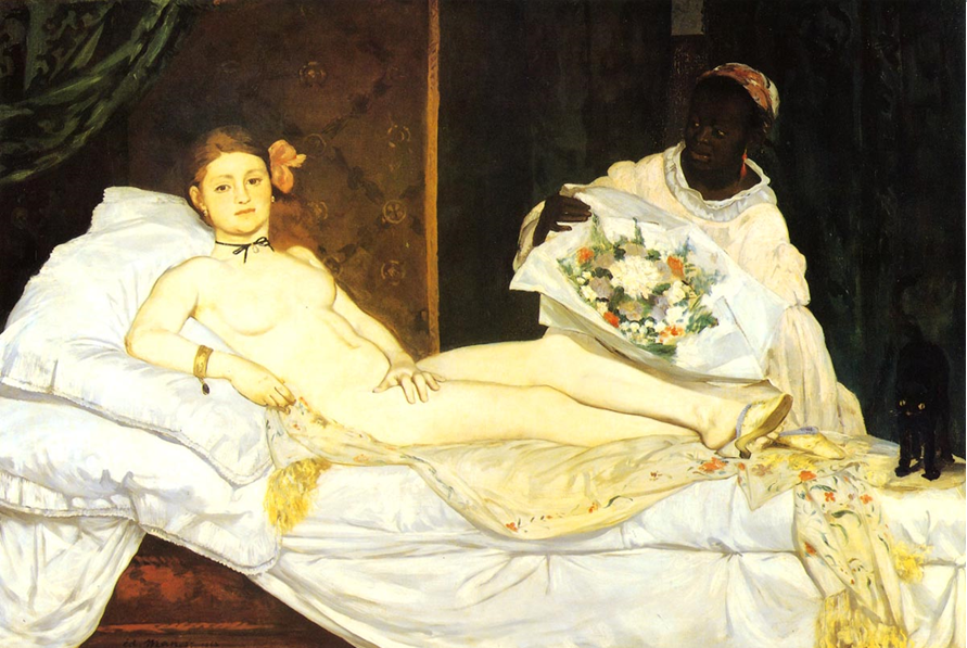 而画面中这位象征“奥林匹亚”的女性也不像乔尔乔内的《沉睡的维纳斯》(Sleeping Venus)那样纯洁,也不像提香的维纳斯那样以煽情的姿势轻柔地撩起人类的欲望,而是毫不受约束地、坦率地直视着观众,似乎观众刚刚走进了她的房间,而她带着挑逗的神情在说:“我在这儿,你们打算怎么办?”所以,相对传统的女人体画而言,《奥林匹亚》表现的这位女性更具有侵略性。
