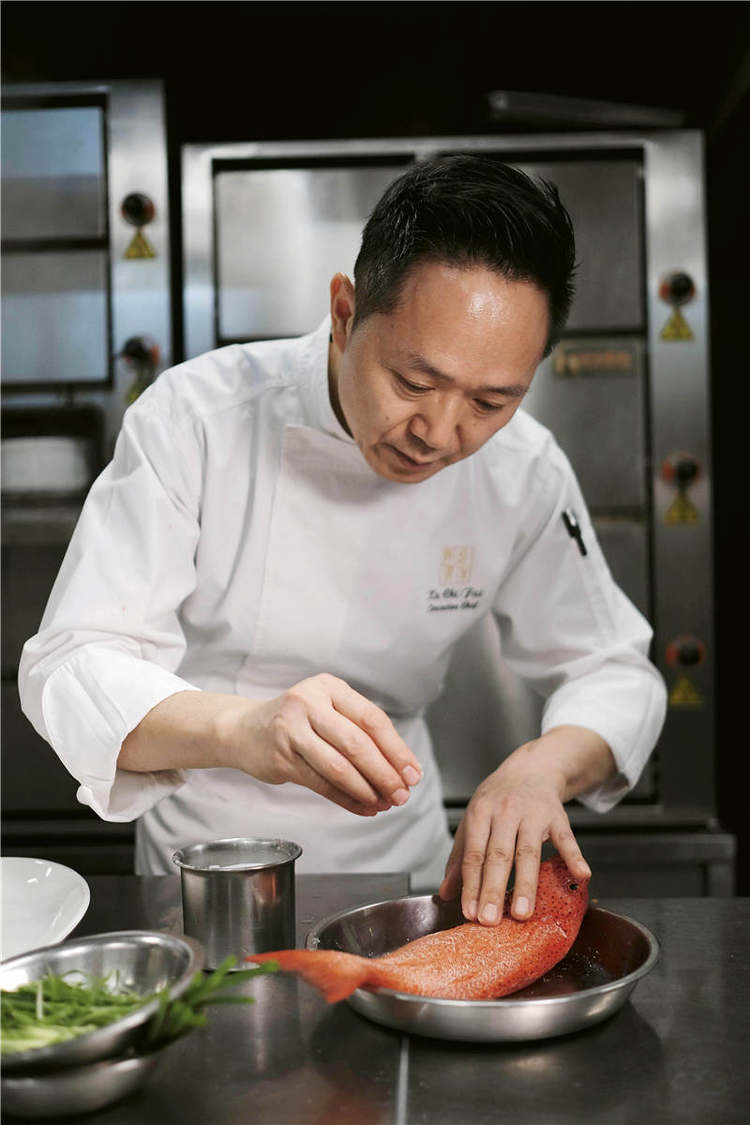 在北京厨房行政总厨古志辉的心里,一道新鲜的鱼最好的做法必须是清蒸。古志辉是香港人,有着一只打小被粤菜浸润的胃,“不食不时”是他面对食材最基本的底线。他手里这条东星斑,刚从市场送来,鱼的颜色红得娇艳。“几乎半个月才能有一条野生的。我们卖也要1300元一斤。”看到鲜鱼,古志辉的兴奋劲儿都透了出来。蒸鱼用的配菜简洁到只有一些切好的姜葱,连个蒜头都没有。蒸之前先用盐擦遍鱼的全身,两面抹匀,洒上一点料酒,盖上姜丝小葱,上锅蒸7分钟,鱼便被端了出来,肉质纯白像牛奶,跟红色的鱼皮相映照,煞是好看。热油一浇,伴随着“吱吱”的声响,一道菜便完成了。整个过程行云流水,简单到让我嘀咕:“这样确定好吃吗?”一入嘴,瞬间懂得了做法的好处,鱼肉鲜甜,简单纯净到无可挑剔。“保留食材最本初的味道是对食材的尊重。”古志辉告诉我。