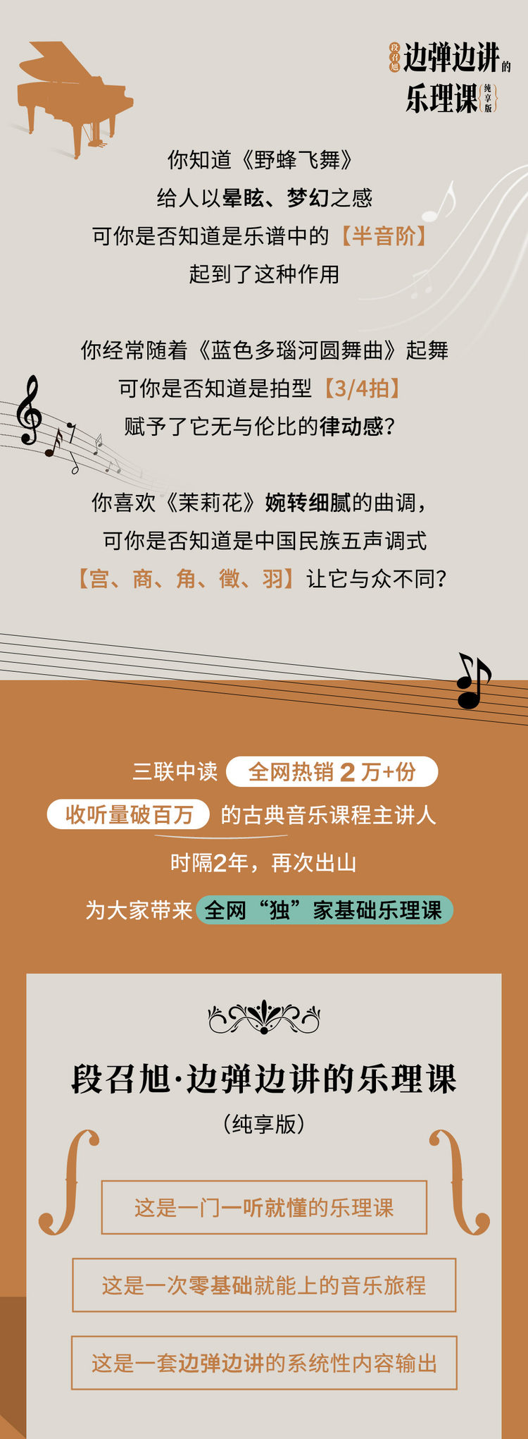 《段召旭·边弹边讲的乐理课》为《段召旭·古典音乐提升营(乐理篇)》的纯享版,报名过训练营的同学请不要重复购买~