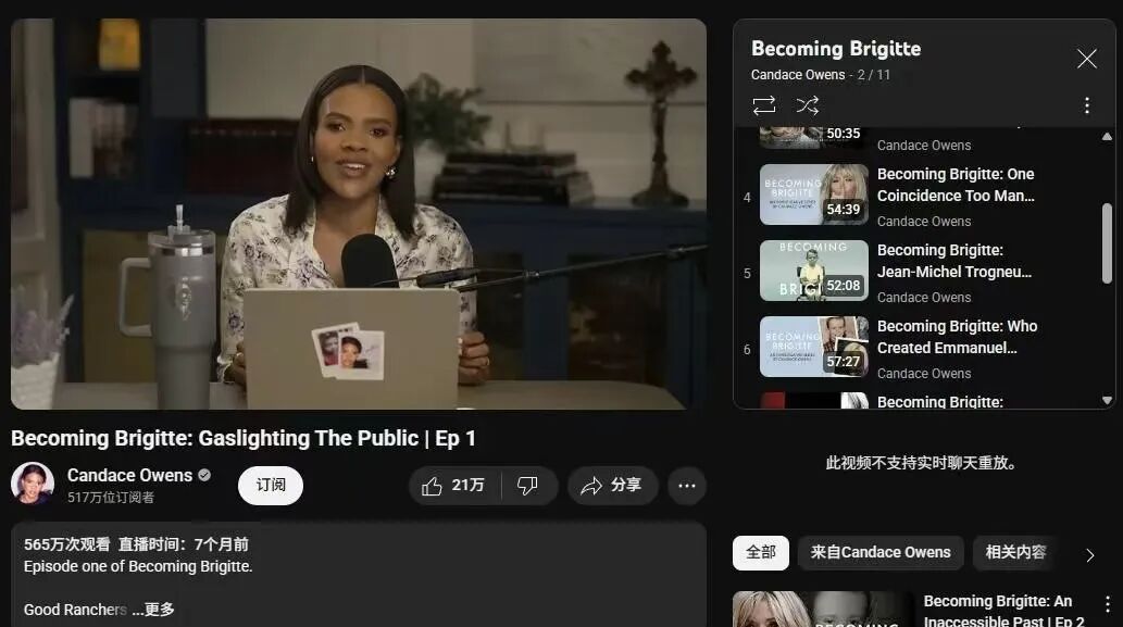 《成为布丽吉特》系列播客仅在油管的总播放量就超过三千万,除性别质疑外,欧文斯还认为布里吉特曾性侵、操纵马克龙,而马克龙是美国中央情报局(CIA)用“精神控制计划”(MKUltra)培养的傀儡。在此期间,马克龙夫妇曾三次向欧文斯发函,要求其撤回言论。但欧文斯更像是将这种回应当作彰显自己影响力的勋章,她会在更新播客的同时把律师函展示在视频中,一边阅读一边进行反驳,并反复强调她就是认为布丽吉特是男性,是马克龙和布丽吉特利用强权压制新闻媒体,向大众掩饰真相。