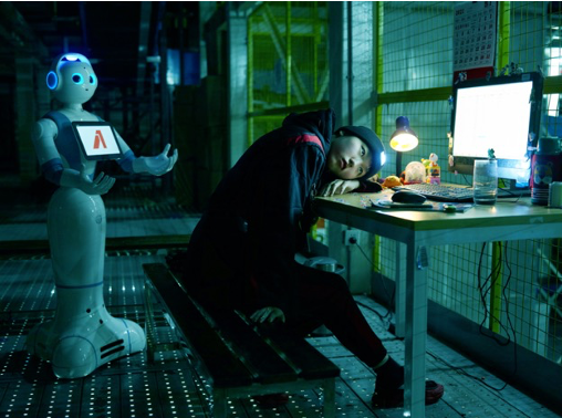 影片里面只有一名男工、一名女工、以及一个机器人,是“人与非人”,也是“有人和无人”,一个挺极致的场景。有评论家说,这部影片像是《摩登时代》的当代版本,是一个关于“无人化工厂中爱情与孤独”的寓言。