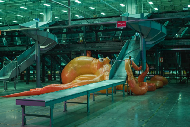 进入京东“亚洲一号”的那一刻,我被彻底震撼了。那是一种冷静到极致的空间,所有运转精准、自动化的机械系统组成了一种“未来的荒漠”。这里已经没有了人,没有表情、没有噪音,只有冷峻的秩序和无声的节奏。