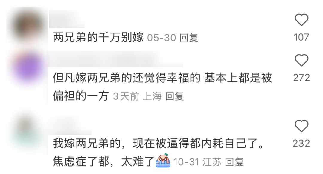 而在不少长辈眼中,两兄弟家庭,才是相亲简历中的最大避雷项。“各地的传统婚俗理念,大多都是男方买房,可这么大的经济支出,家里还要备下两份,必然难做到平等周到。”