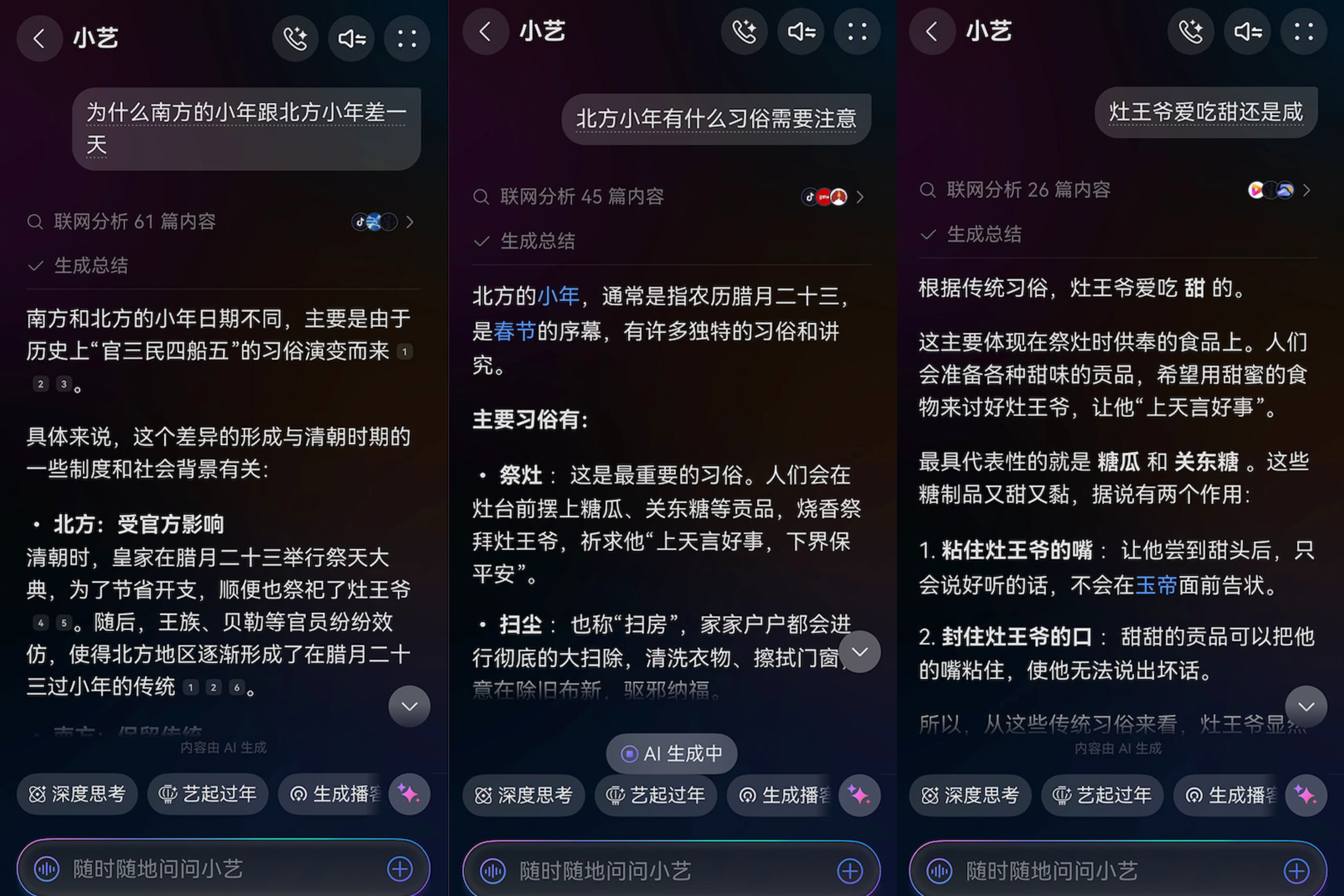 “南北小年差异源于古代官民习俗……”小艺认真地回复着,其间还开始详细讲解扫尘“除陈布新”、祭灶“送灶王爷言好事”的寓意,并推荐了“甜灶糖配年糕”的南北融合食谱。一场潜在的“争论”,就这样在小艺的娓娓道来中,变成了全家围坐聆听的“民俗小课堂”。