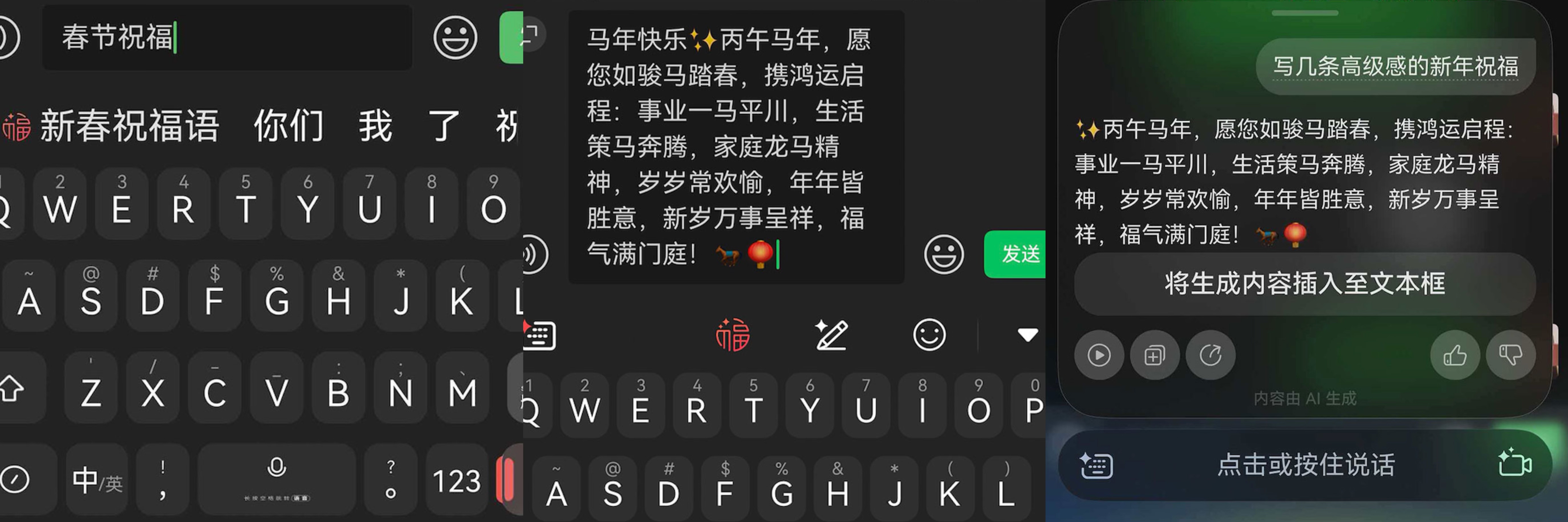 当对话框里弹出“新年快乐”时,夏栀只需输入“新年好”等触发词,小艺输入法的「节日触发词」功能便自动联想出多条应景的祝福语供她快速回复。