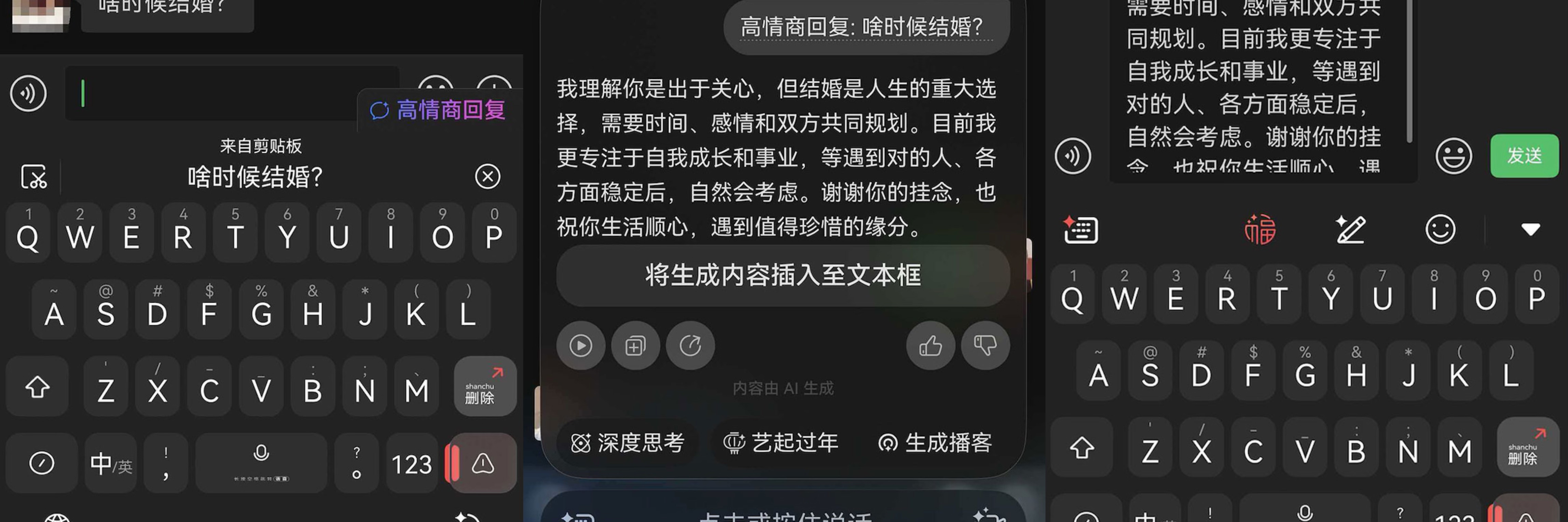 面对亲戚群里“工资和对象的灵魂拷问”,小艺也能生成不失分寸的婉转回应—— “工资够花不愁吃,先陪长辈好好过年,缘分慢慢等”这类话术,不冷场、不冒犯,在人情往来中留一份舒适的边界感。