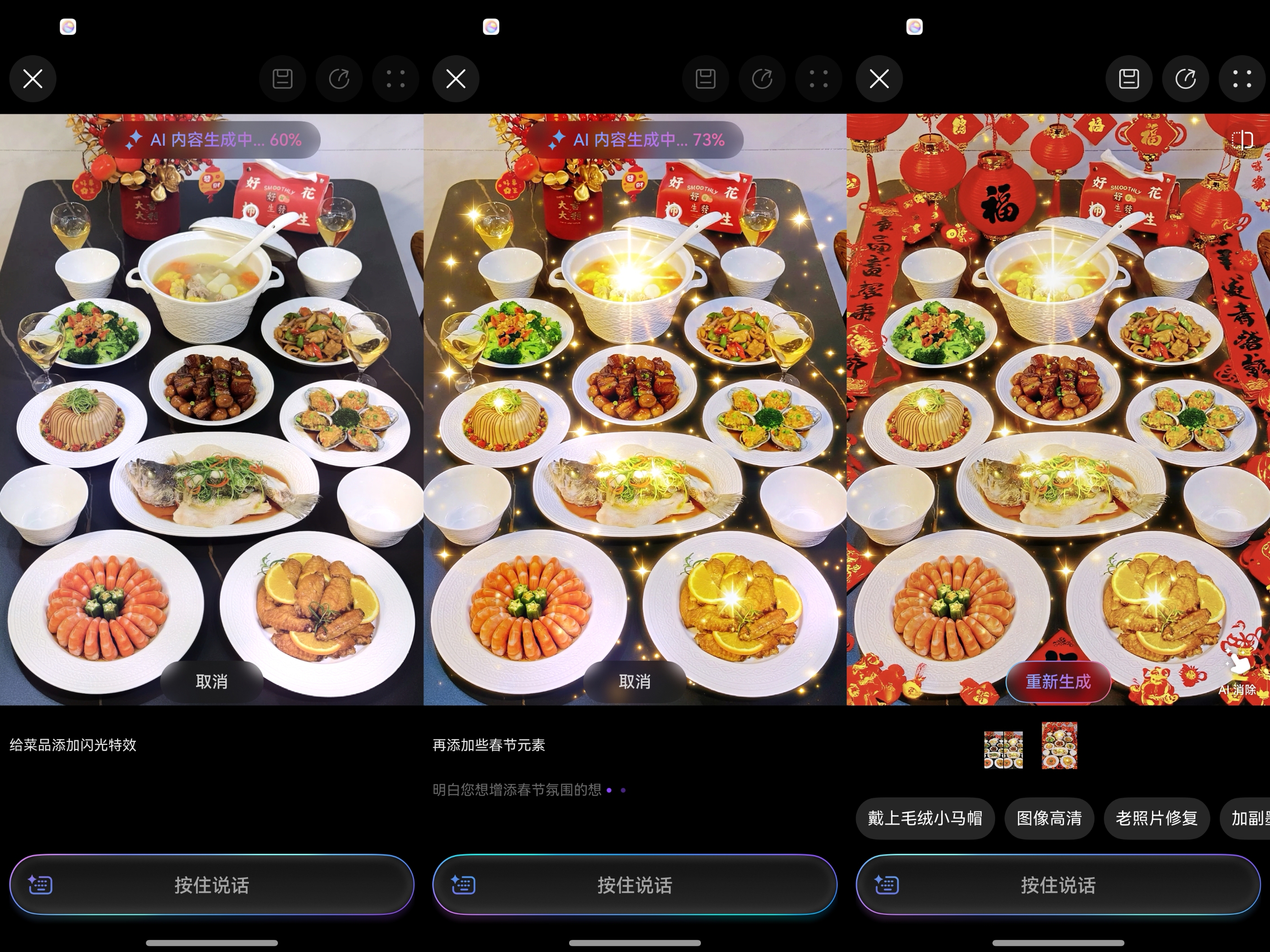 对着满桌佳肴与家人笑颜拍完照,她只需将照片交给小艺,吩咐一句:“给菜品加闪闪发光的特效,再添点春节元素。”小艺便听得懂——智能算法为菜肴点缀晶莹光效,在画面一隅添加福字、灯笼,甚至根据菜色匹配动画与吉祥文案。无需复杂修图,一句吩咐,团圆时刻便升华为一张年味十足的光影留念。