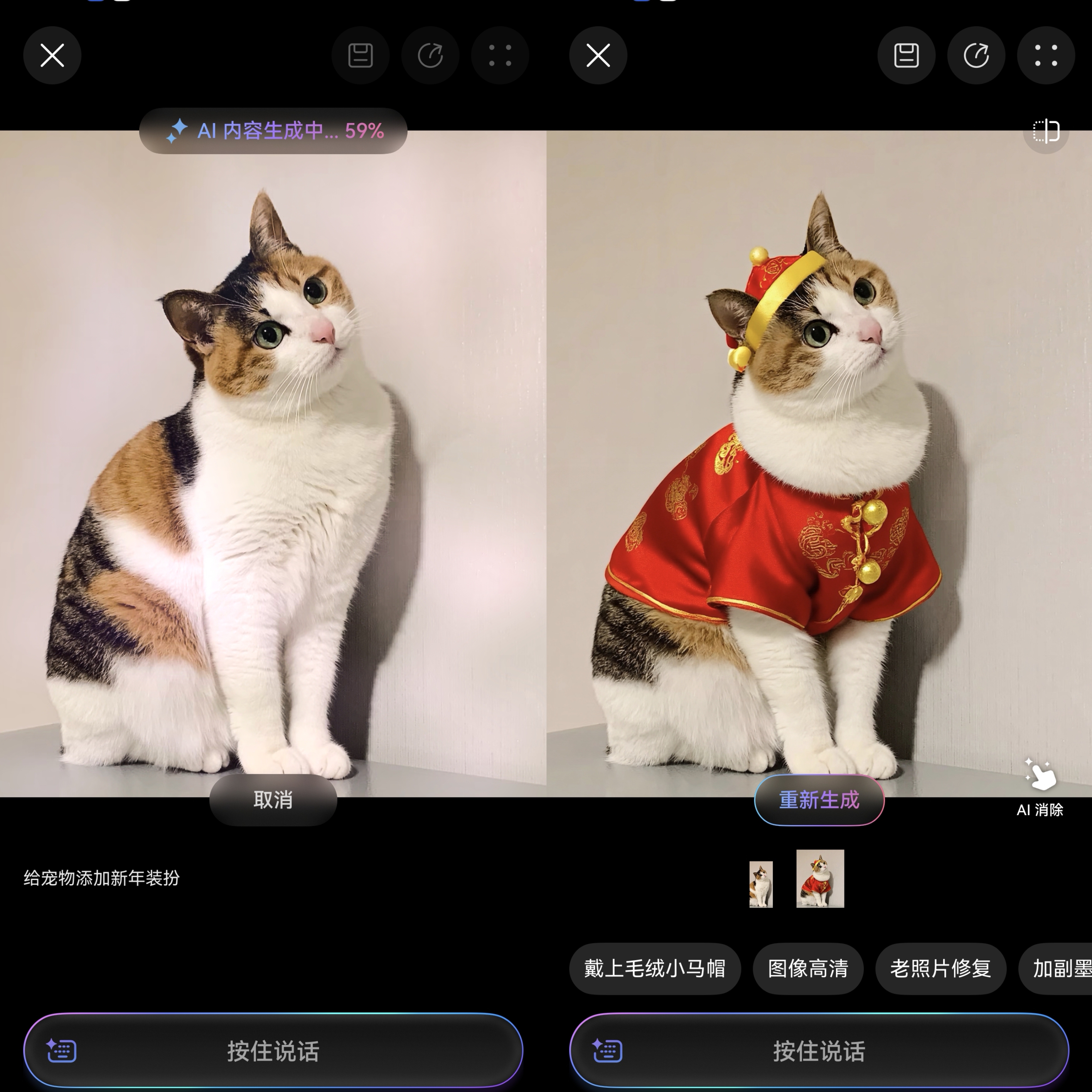 家里猫咪也要过个“马年”。“小艺,给猫咪穿上新年装扮。”眨眼之间,专属宠物新年照轻松出炉。有了小艺助力,子涵的新年朋友圈,妥妥成了“点赞收割机”。