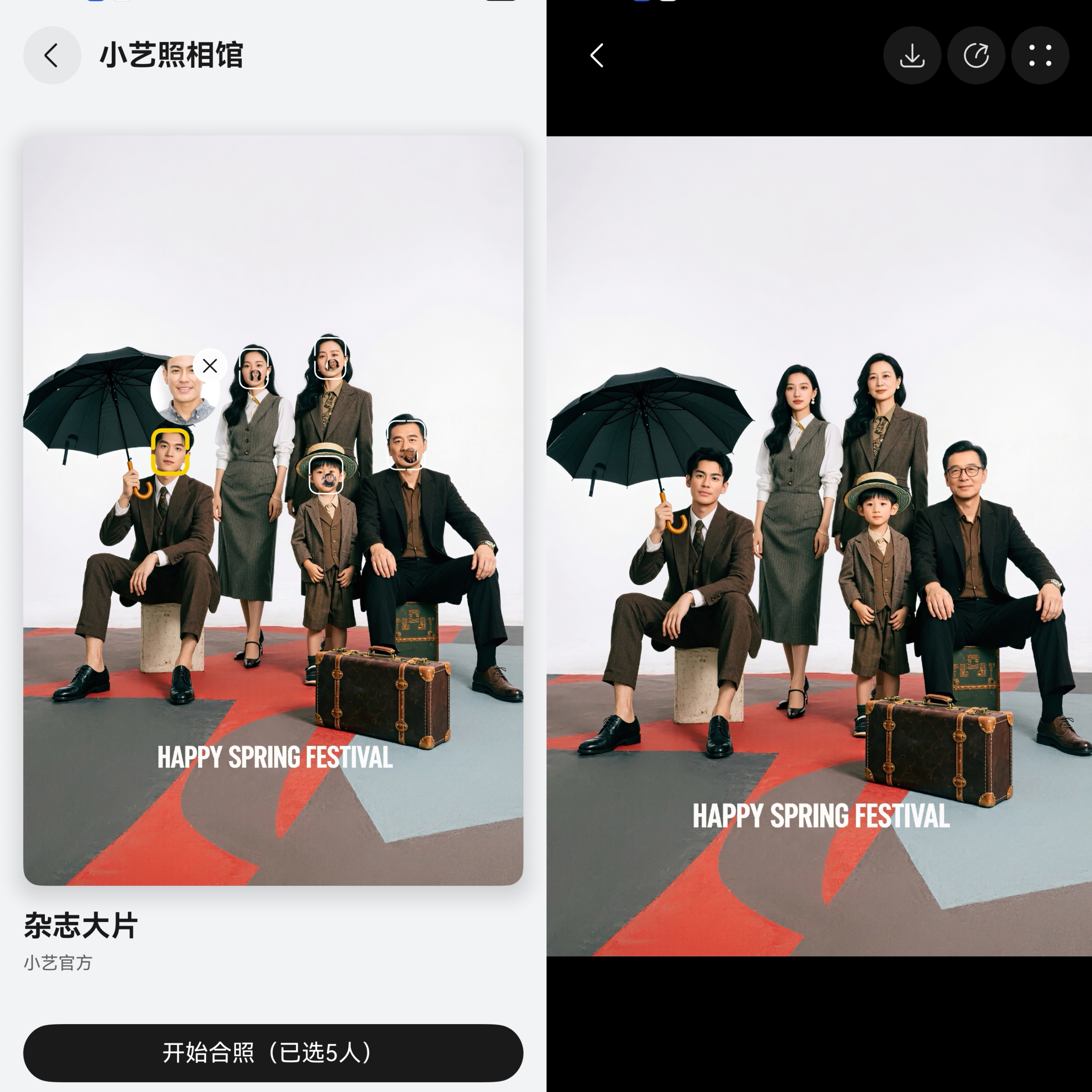 更温暖的是,虽然异地工作的哥哥这次不在,但只需上传每个家庭成员的单人照至小艺照相馆,就能生成一张毫无违和感的“云端全家福”。小艺智能调整每个人的表情与姿态,让分散的家人“同框”相聚,仿佛从未分开。