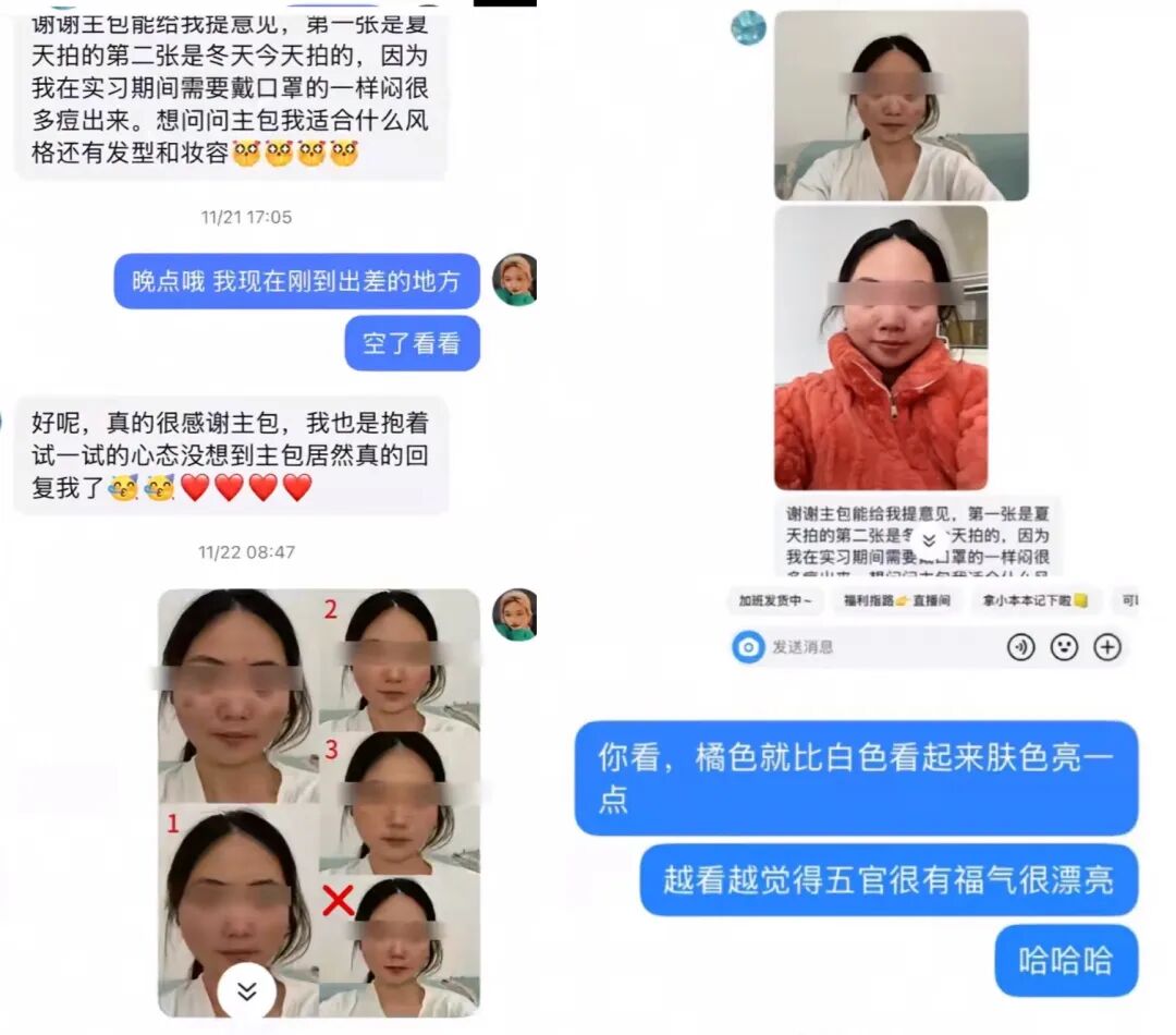 除了拍视频,评论区、粉丝群、后台私信里的求助,她有空就回。有人发来素颜照问建议,她甚至会直接用修图软件帮对方P个妆,再配上文字讲解。