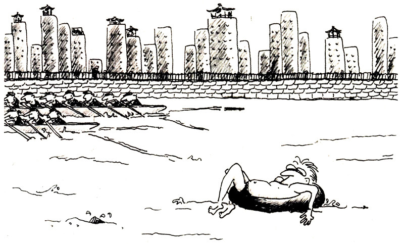我听说北京大学有个自行车协会,清华大学的学生也该全骑自行车吧,所以,搞个自行车比赛不也挺好?可既然搞上了划船比赛,那就该把它搞好。大学嘛,总该给这条河、这座城带来点儿气氛。可实际情况是,昆玉河不是以划船赛闻名,而是以天然大澡塘子闻名——众多民工拿着肥皂下河洗澡游泳去也。当年,治理这条水路,清除淤泥,砌上水泥砖的河床,就有市民说:这不是修澡堂子嘛?没办法,咱们的河只能这样。